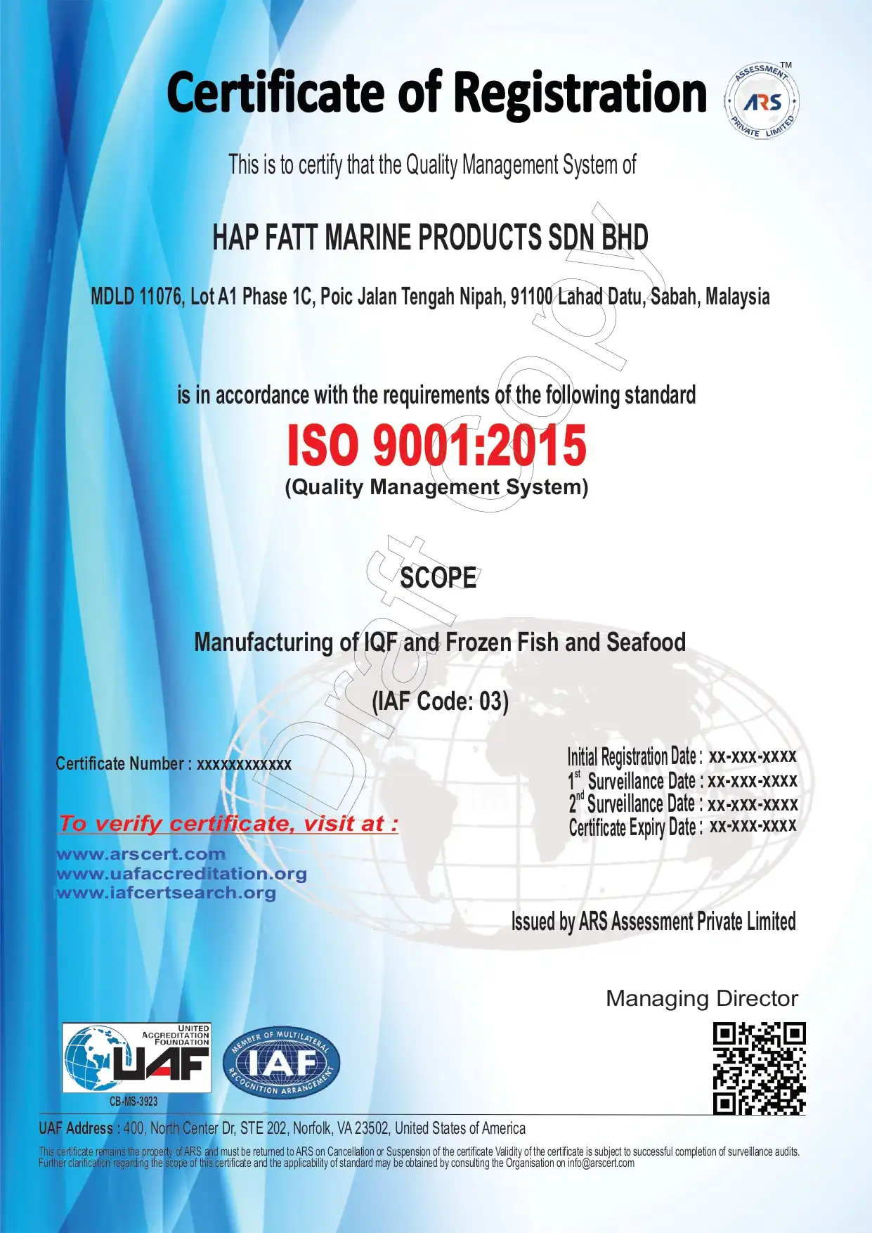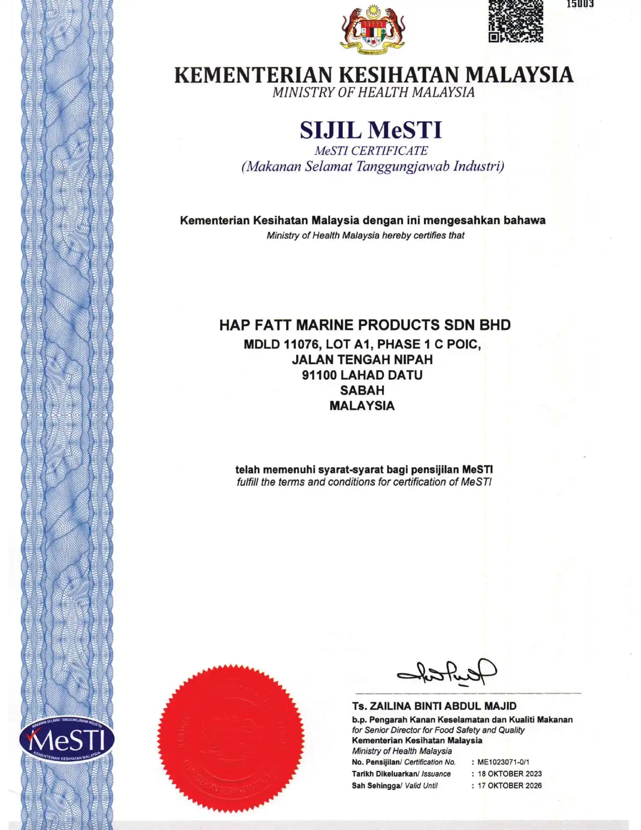Our factories strictly adhere to professional accreditation requirements for processing environment, machinery, safety, and hygiene to meet all standards for our marine products. Appended below is a list of our professional accreditations:
