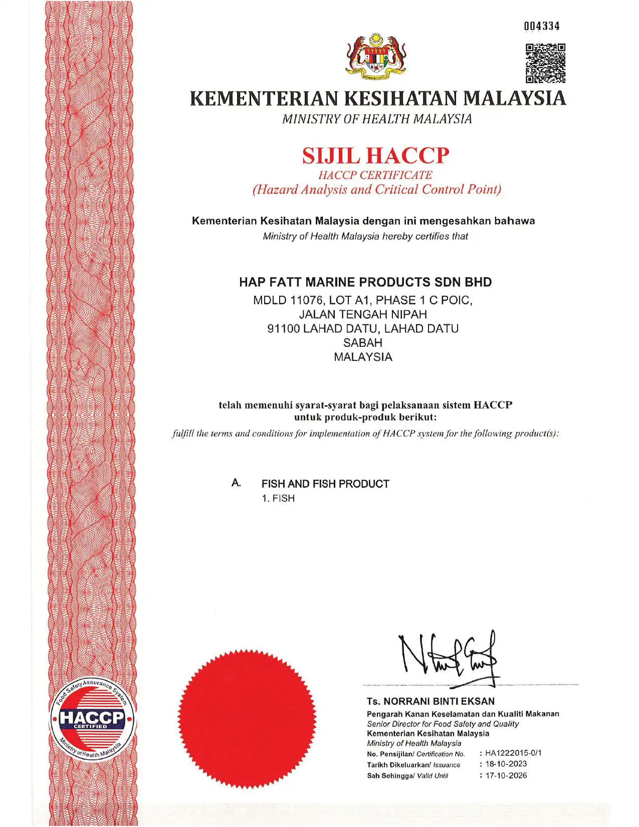 Located in Lahad Datu, our two frozen seafood processing plants span 1.8 acres and are designed for high efficiency, safety, and quality. Equipped with modern facilities and certified under the HACCP international food safety management system, our factories adhere to stringent standards across all departments and processes.